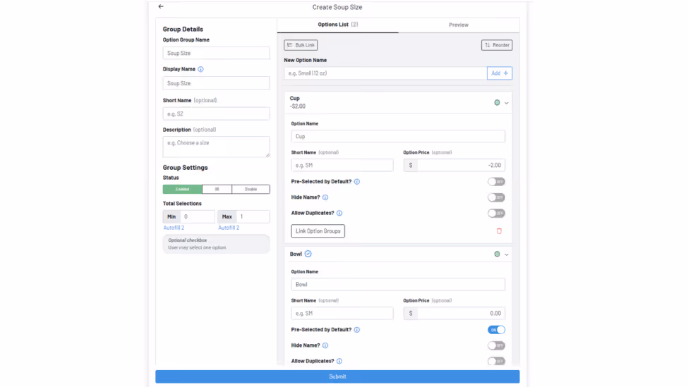 Instead of editing each product individually, now you can create reusable Option Groups—like sauces, dressings, or upsells—and apply them across multiple products. Bulk updates are easier than ever, while still giving you the flexibility to customize pricing, visibility, and availability at the product level.